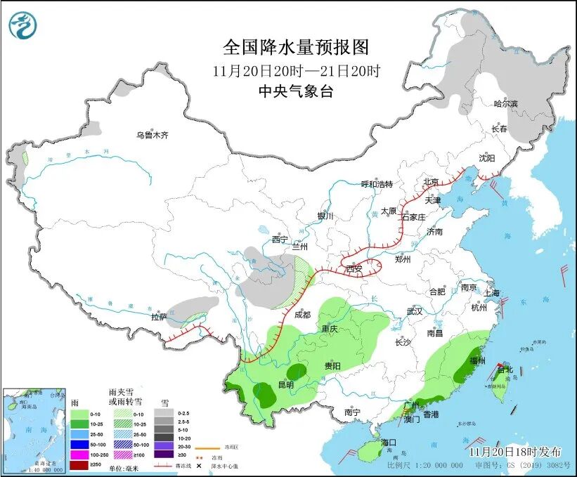 中央气象台预计,20日20时至21日20时,内蒙古东北部、黑龙江大部、吉林东部、青海南部、川西高原北部等地部分地区有小雪或雨夹雪。湖南西部、江南中东部和南部、西南地区东部和南部、广东东北部、海南岛、台湾岛等地部分地区有小到中雨。