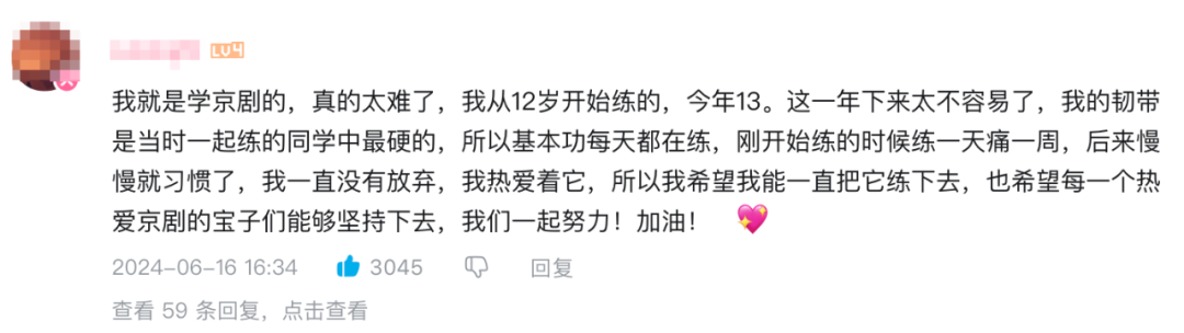 在她发布的京剧学艺视频下,喜欢京剧的年轻一代在留言区再度聚在一起,倾诉着练功的不易,互相打气互相分享学习渠道。你很容易在刷这些留言时,看到一种名叫“生生不息”的东西。