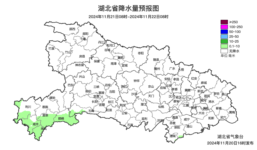 11月21日08时-22日08时,恩施地区阴天到多云,局地有小雨;其他地区多云间晴天。最高气温恩施地区12~16℃、其他地区16~19℃,最低气温北部4~7℃、南部7~11℃,偏北风2到3级。