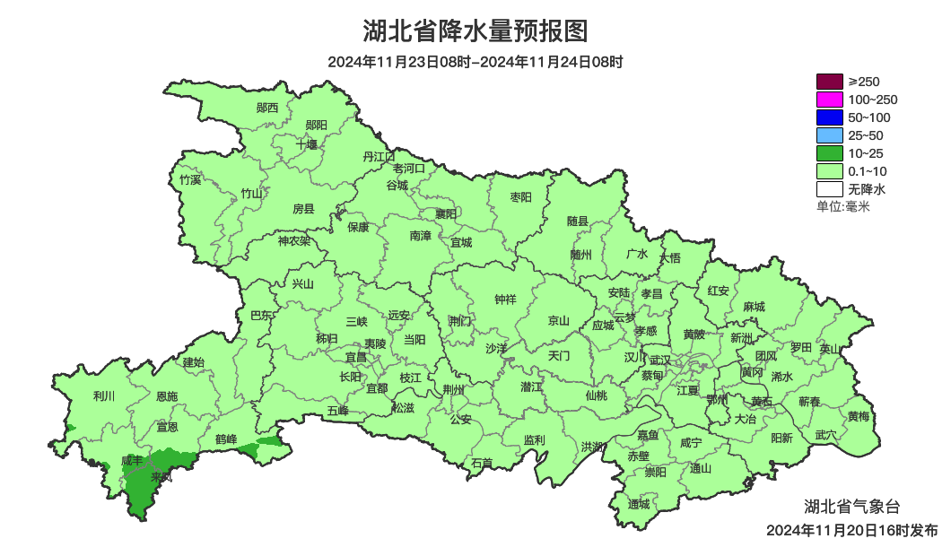 11月23日08时-24日08时,鄂西南阴天有小到中雨;其他地区多云转小雨。最高气温西部12~16℃、中东部16~19℃,最低气温北部5~8℃、南部8~11℃,偏东风3到4级。