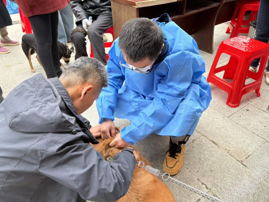 △11月18日,志愿者为陈策楼镇辖区50余只“汪星人”接种疫苗、指导主人办理养犬证。