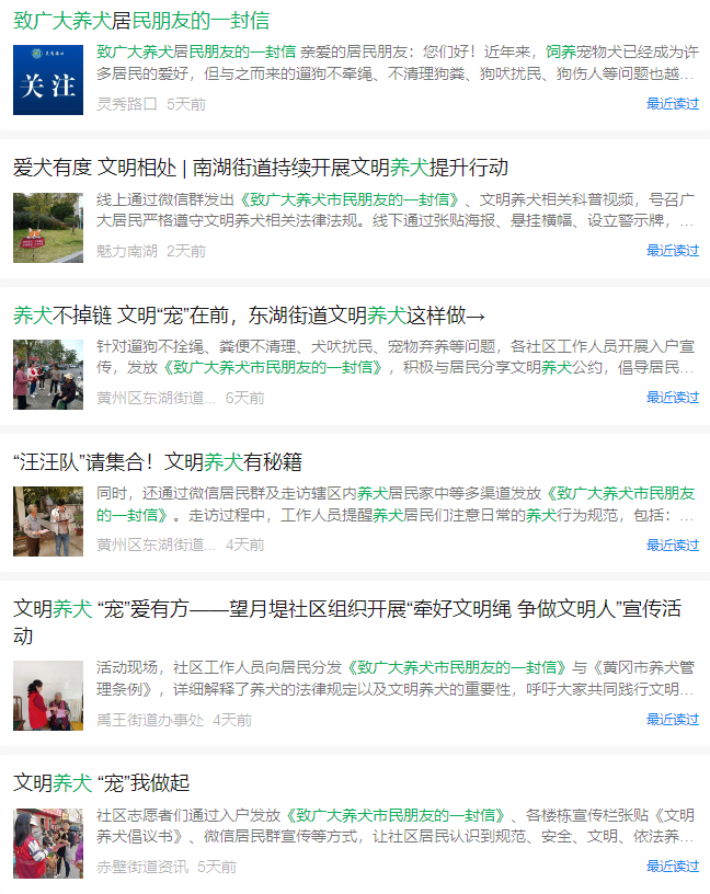 在宣传引导方面,黄冈市养犬管理工作领导小组办公室发布了《致广大养犬市民朋友的一封信》,呼吁广大养犬市民朋友遵守《黄冈养犬管理条例》,主动登记、规范养犬,加强管理、安全养犬,爱护环境、文明养犬,遵守条例、依法养犬。各街道办事处和社区也在自己的公众号上刊发倡议书,进一步扩大了宣传覆盖面。