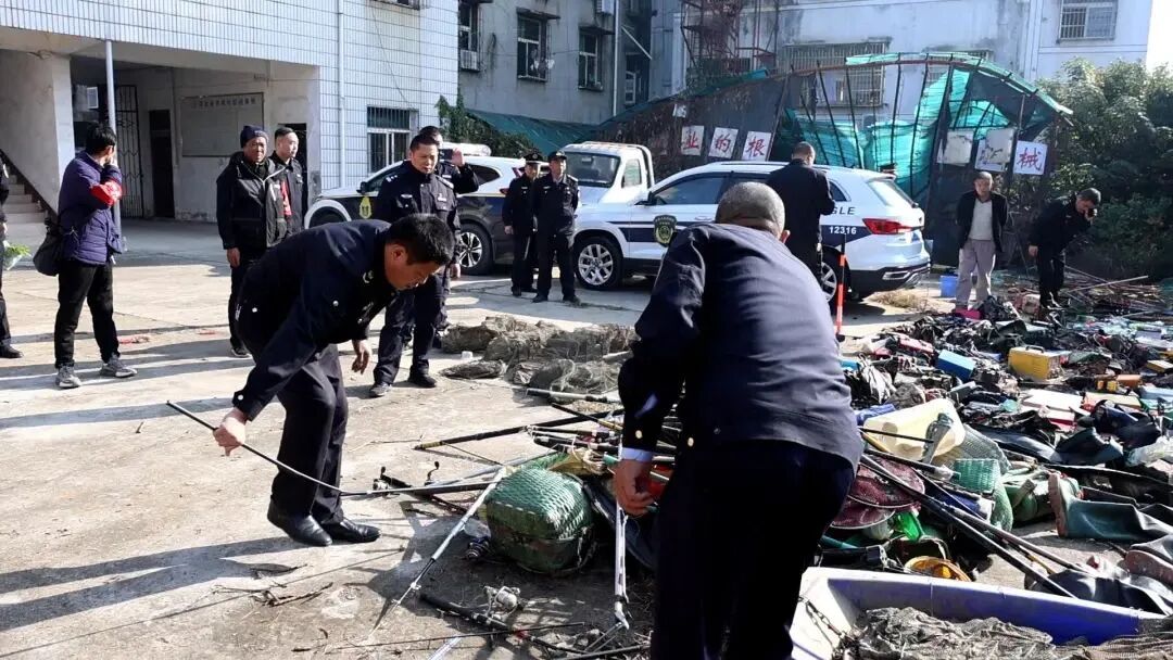 11月21日,在红安县农业综合执法大队前办公楼院内,一场针对违法渔具的集中销毁行动正在进行。红安县多部门对收缴的自制简易渔船、汽车轮胎渔筏、刺网、钓竿等违禁渔具进行集中处理,通过捶打、切割、焚烧等方式予以物理销毁。
