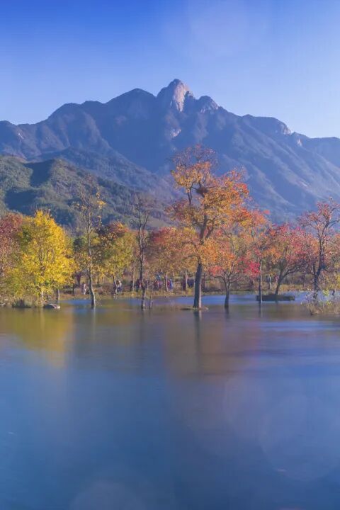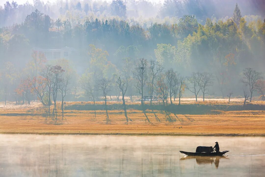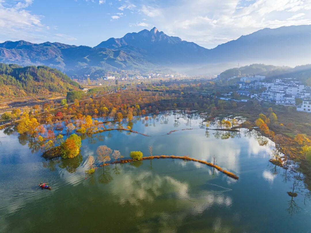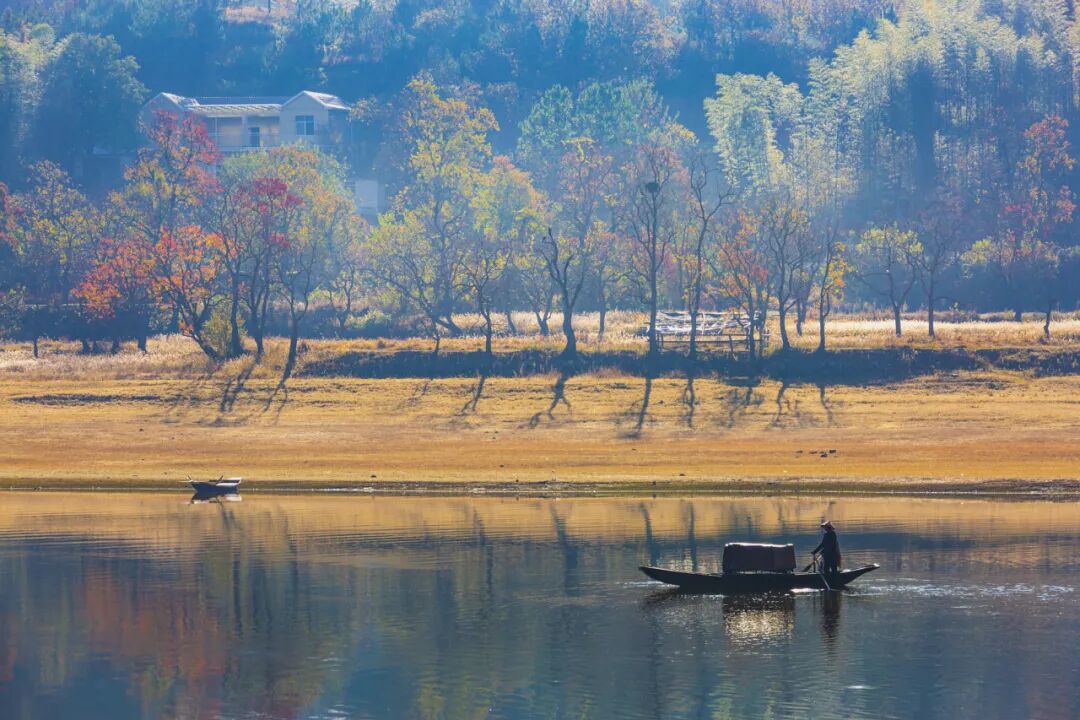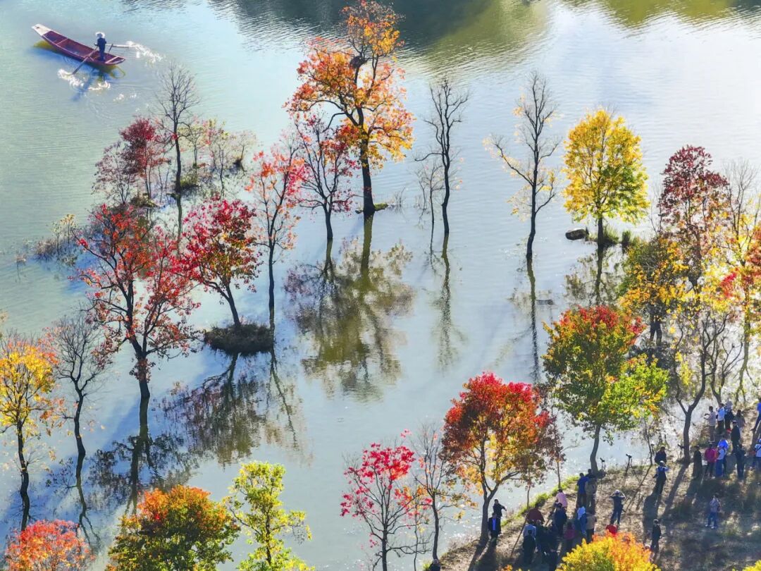 尤其是河西畈的水上红叶,更是如仙境般存在。这里有一片约300亩水面的池塘,池塘东北边生长着一片乌桕树。每年秋风拂过,这里便成为全国摄影爱好者的打卡胜地。水中的红叶树宛如仙子披着霓裳舞衣,在如镜的水面上翩翩起舞,那曼妙的舞姿倒映在水中,如梦如幻、如诗如画。偶有当地渔民划着小木船载着一两位红衣美女在湖面上游弋,更是引得挤满塘埂的摄影师们快门声此起彼伏。