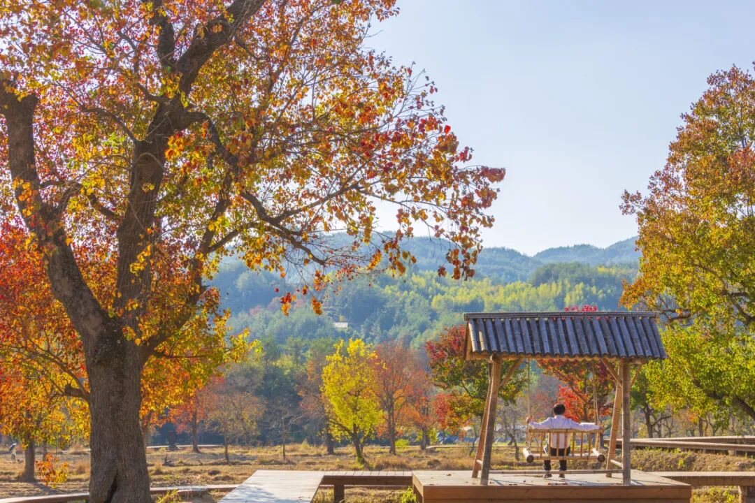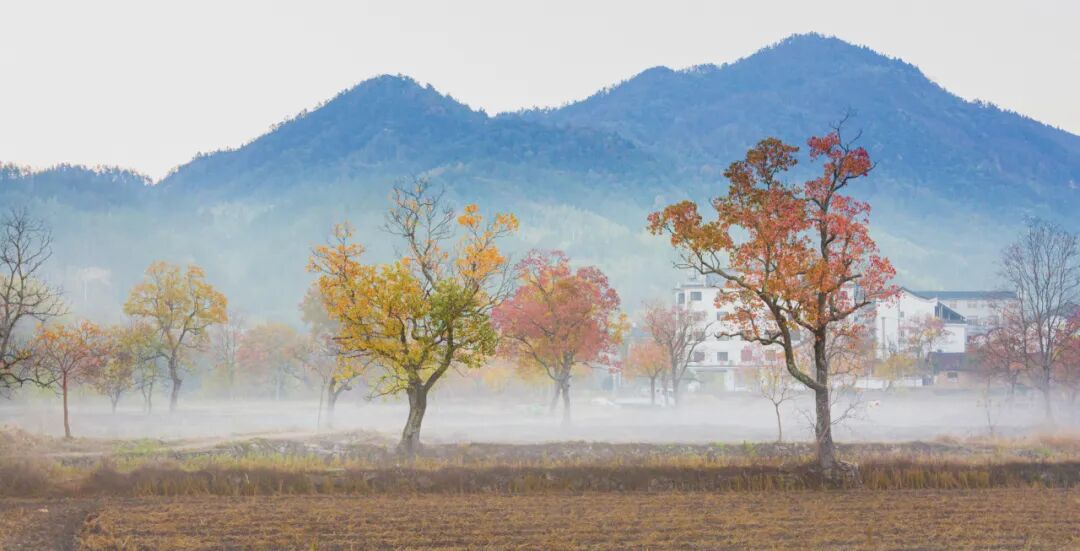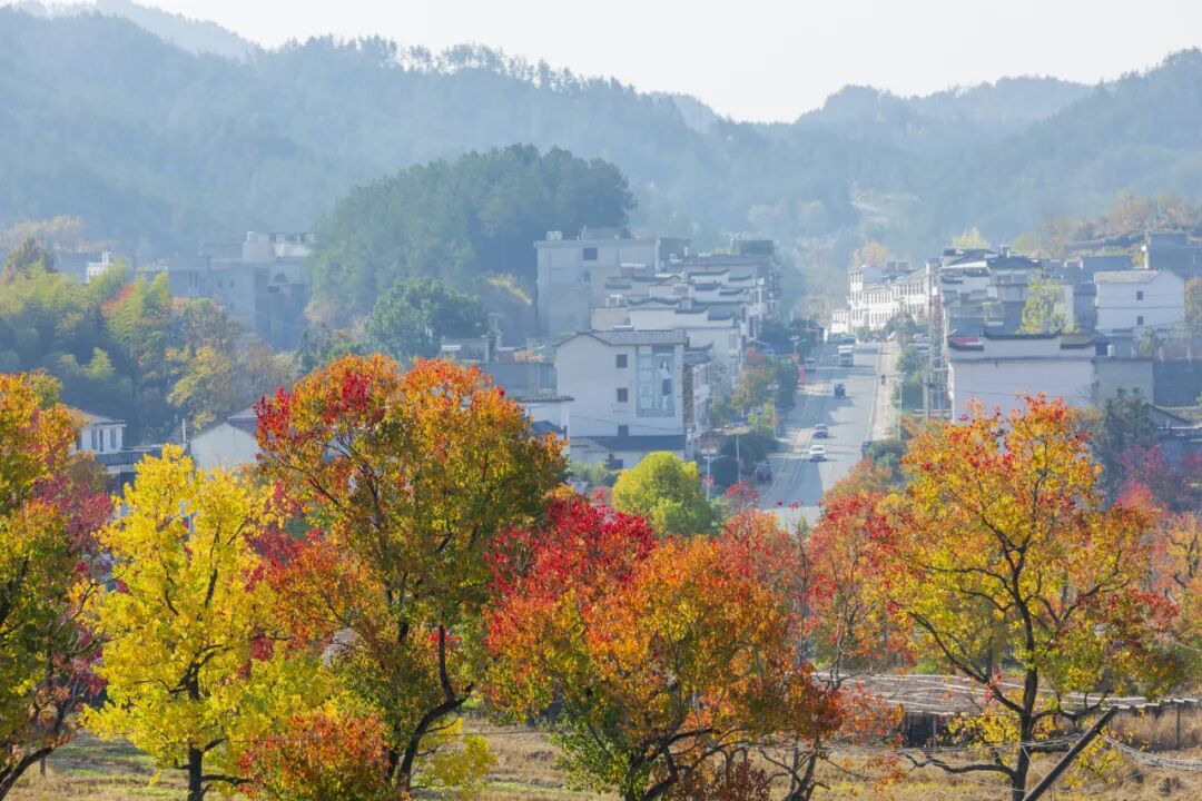 九资河畔的乌桕树,是全国最为集中的分布地,古镇内古乌桕树近万棵,中小乌桕树更是数不胜数。它们或矗立于山间田野,或点缀于房前屋后,或依偎于池塘边,或静立于小溪畔。每一棵乌桕树都宛如一幅精美的画卷,将红黄绿色交织的叶片与白墙灰瓦的建筑以及整洁优美的田园风光完美融合,构成了一幅幅直挂天际的绝美景致。