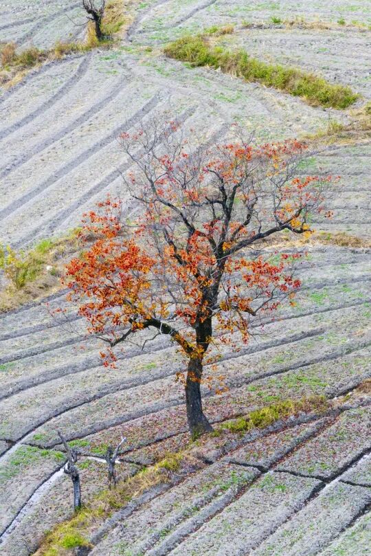乌桕树的叶子并非一蹴而就地变红,而是经历了一个渐变的过程。树龄的差异、阳光照射时间的不同,使得每一棵树、甚至同一棵树上的叶子都呈现出绿黄红交错的层次渐变。鹅黄、金黄、橙黄;粉红、火红、暗红;浅绿、碧绿、墨绿……各种色彩交织在一起,仿佛是大自然最绚烂的调色盘。随着时间的推移,乌桕树上的叶子逐渐变得鲜红欲滴,那红色仿佛能映照出人的脸庞,一片片挂在树枝上,在风中摇曳,在阳光下闪耀,绚丽无比。即使树上的叶子已经稀疏,但那点点红叶与白墙黛瓦依然构成了一幅天然的风景画,美不胜收。
