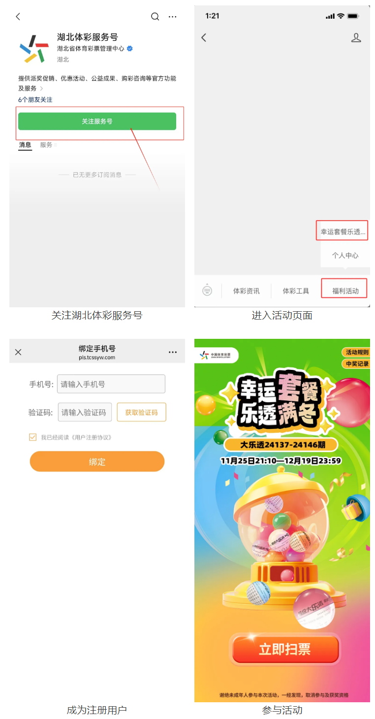 微信搜索并关注湖北体彩服务号,点击底部菜单栏-【福利活动】-【幸运套餐 乐透满冬】进入活动页面,根据提示扫描彩票参与抽奖。