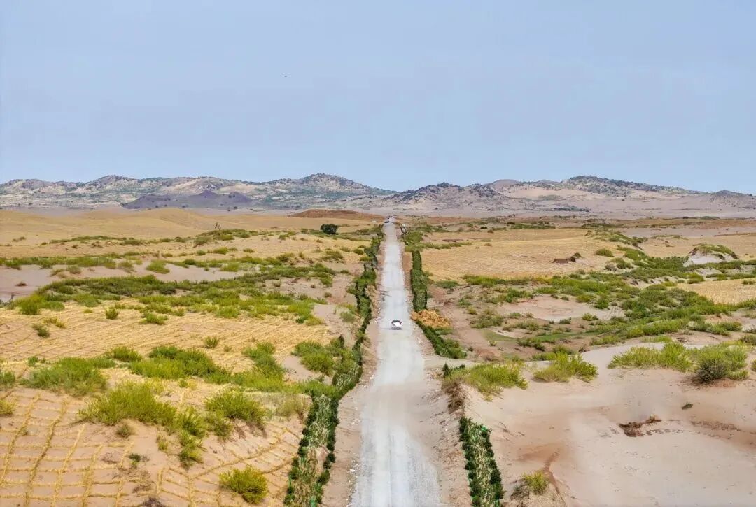 △配图为在赤峰市翁牛特旗巴彦呼交嘎查其白线防沙治沙项目区,穿沙公路将沙地切割,沙丘被逐步固定。连振摄(新华社)