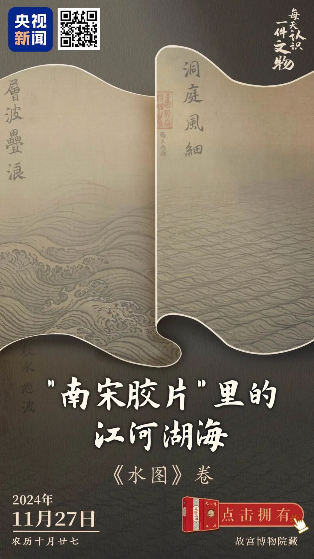 央视新闻联合全国博物馆推出文博科普产品《文博日历》,每天带你认识一件文物。南宋《水图》卷,全卷12幅画,一格一格整齐排列恰似一卷拍摄完成的胶片,从静谧到汹涌,从细腻到壮阔,画尽了江河湖海的气韵与独属于水的中式美学。画家马远以精湛的笔墨勾勒出水的百变姿态,他笔下的浪花也由此成为“经典”,在其后的历代山水画中被不断沿袭。