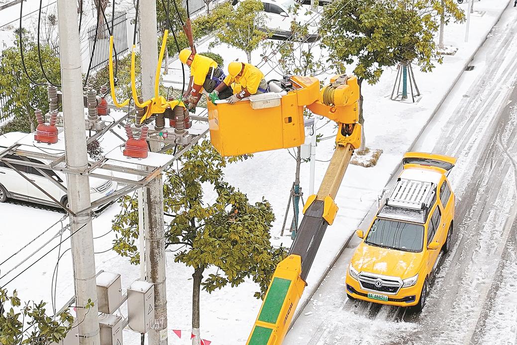 2月22日,受雨雪冰冻天气影响,黄州区赤壁大道一线路出现故障,黄冈供电应急抢修队全力抢修供电设施,保障市民正常用电。