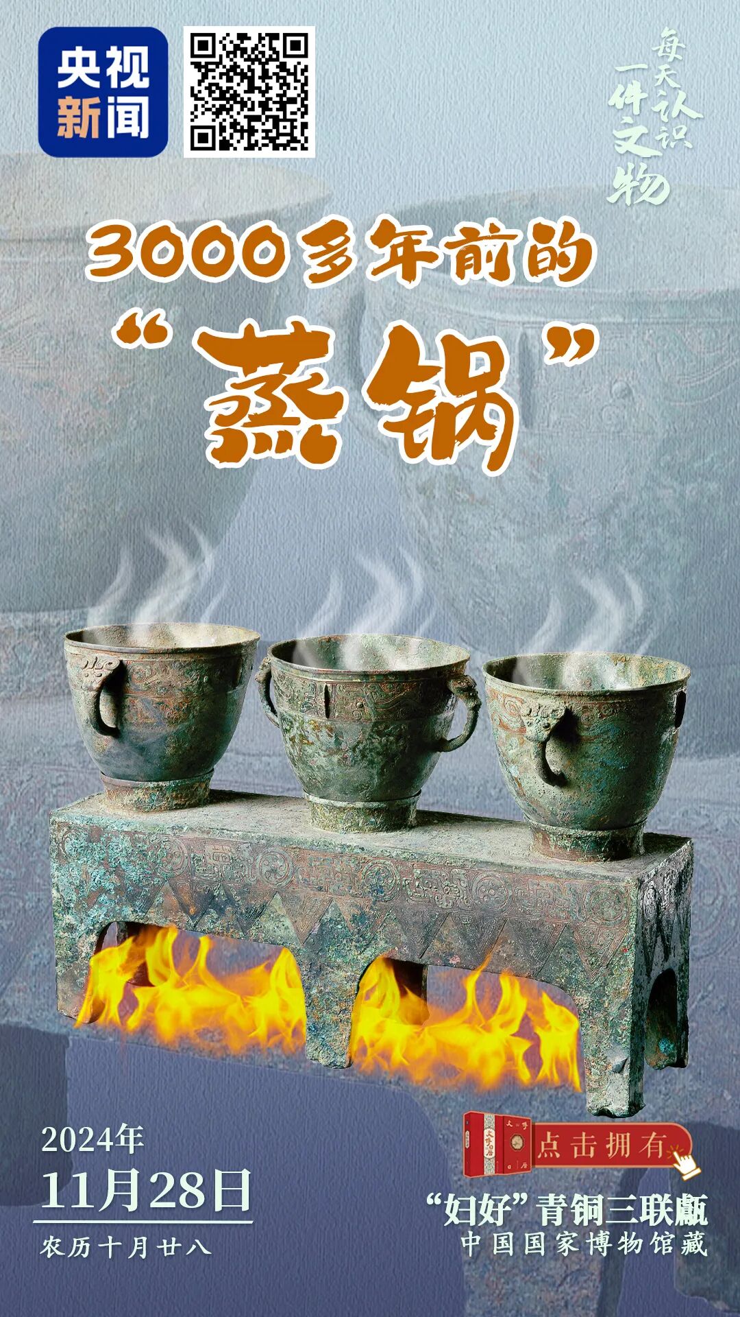 央视新闻联合全国博物馆推出文博科普产品《文博日历》,每天带你认识一件文物。甗(yǎn)是一种古代烹饪用的厨具,分为上下两部分。上部为甑(zèng),用来盛食物;下部为鬲(lì),用来盛水。出土于河南安阳殷墟妇好墓的青铜三联甗,每个部分都装饰有精美的花纹,其纹饰的复杂程度反映出使用者的社会地位。