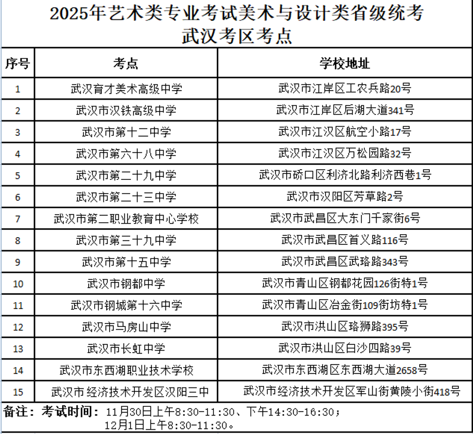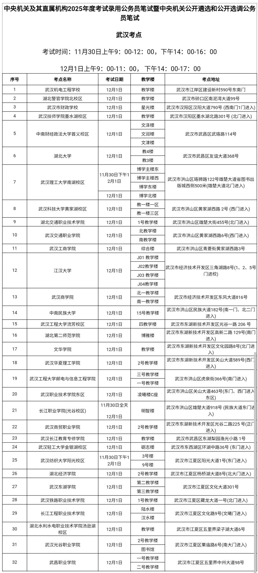 今天(11月30日)、明天(12月1日),武汉市将举行2025年艺术类专业考试美术与设计类省级统考考试,以及中央机关及其直属机构2025年度考试录用公务员笔试暨中央机关公开遴选和公开选调公务员笔试,约有10.83万考生参加,共设考点47个(详见附图)。