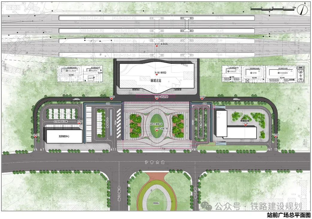 麻城北站位于中心城区北侧经济开发区,为既有站拆除后原址新建站。新建合武高铁站场2台6线,原合武铁路站场2台4线,麻城北站总规模为4台10线,站房面积18000平米(不含架空层、落客平台等建筑面积)。