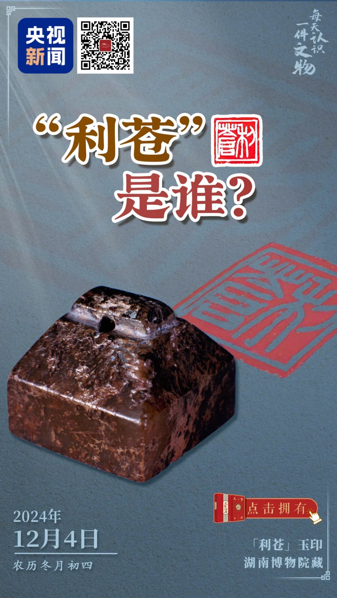 央视新闻联合全国博物馆推出文博科普产品《文博日历》,每天带你认识一件文物。利苍玉印出土于长沙马王堆二号墓,印面上以篆书阴文雕刻着“利苍”两个字。作为大汉王朝的开国功臣,利苍戎马一生、地位显赫,他的妻子正是马王堆一号墓的主人辛追夫人。
