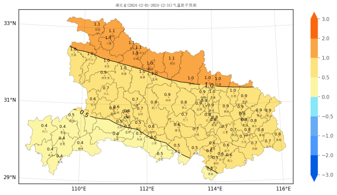 ↑湖北省各县市2024年12月气温距平预测图(℃)