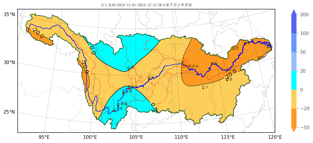 ↑长江流域2024年12月降水距平百分率预测图(%)