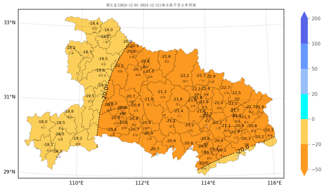 ↑湖北省各县市2024年12月降水距平百分率预测图(%)