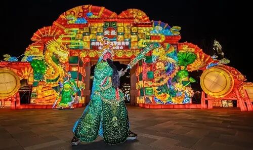 本次庙会的一大亮点,是引入了闻名遐迩的自贡彩灯IP,以关帝为主体,设置“关圣贯古今”“蛇年请好运”“瑞兽迎丰年”“我如此热爱”四大主题,结合襄阳古老的三国文化与现代的国潮元素以及关圣古镇景区的文化底蕴,让传统文化在现代语境下焕发出新活力。