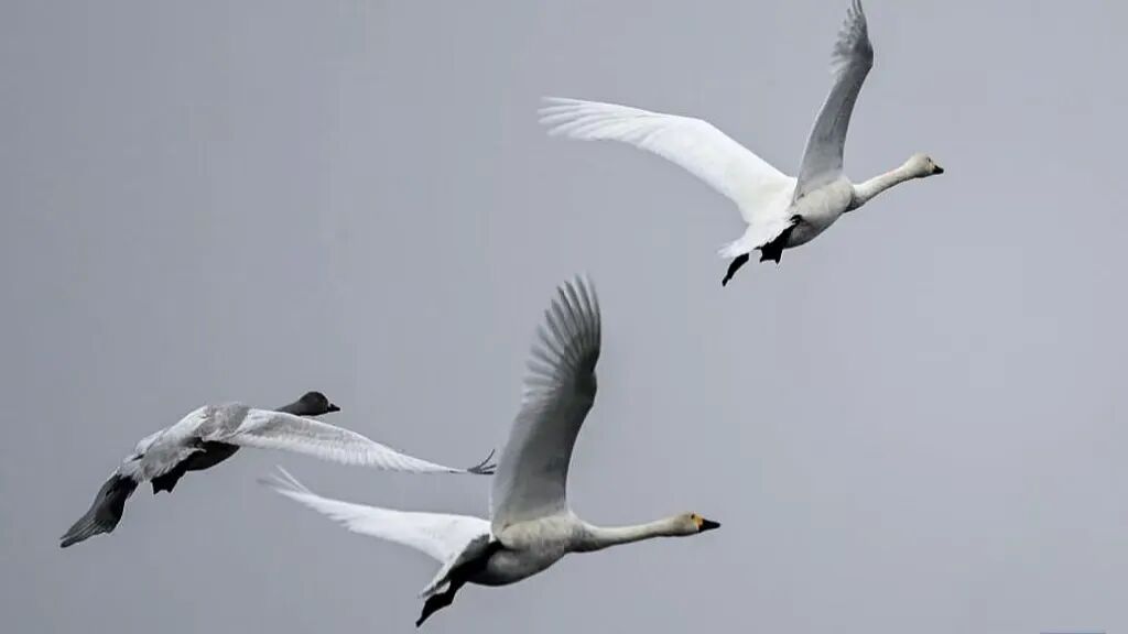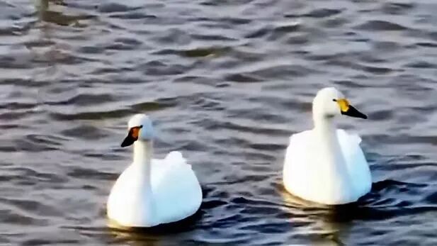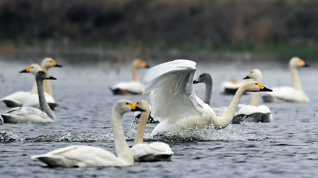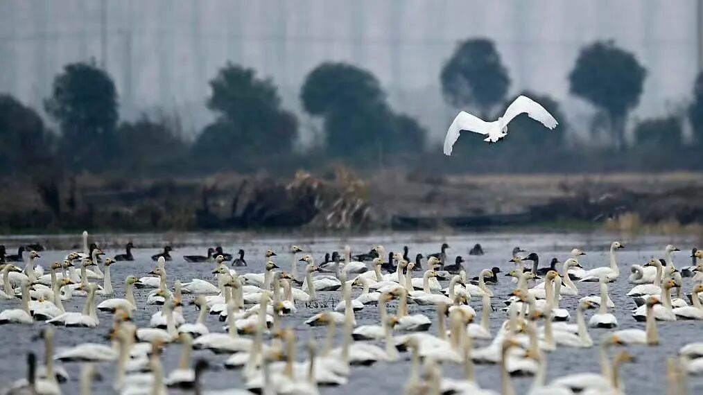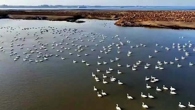 成群的豆雁和天鹅在冬日暖阳下游弋觅食