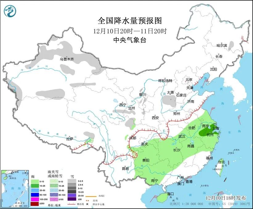 中央气象台预计,10日20时至11日20时,新疆沿天山地区和南疆盆地、西藏东部和西北部、川西高原北部、青海东部、甘肃南部、宁夏、山西中南部等地部分地区有小雪或雨夹雪,其中,新疆南疆西部山区局地有大雪。西南地区东部、江淮大部、江汉东部、江南大部、华南中西部等地部分地区有小雨,其中,安徽南部、江苏南部、上海、浙江北部等地部分地区有中雨。