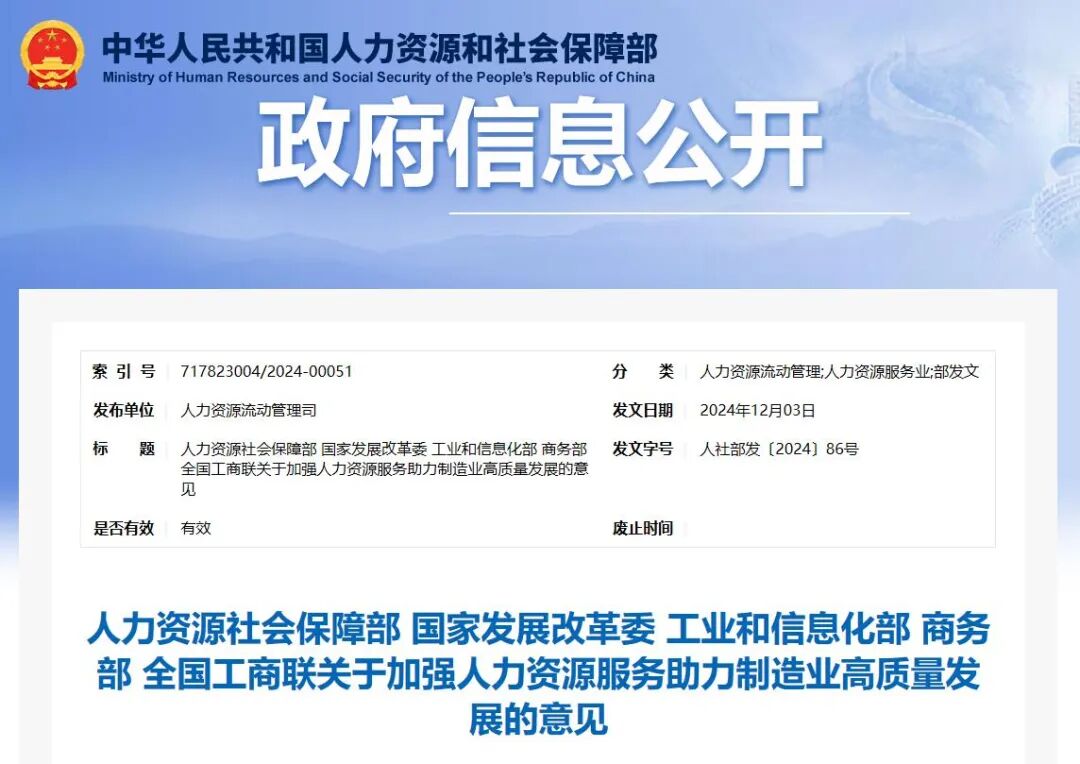 近日,人力资源社会保障部、国家发展改革委、工业和信息化部、商务部、全国工商联印发《关于加强人力资源服务助力制造业高质量发展的意见》,推动人力资源服务业和制造业融合发展,更好助力现代化产业体系建设,积极促进高质量充分就业。
