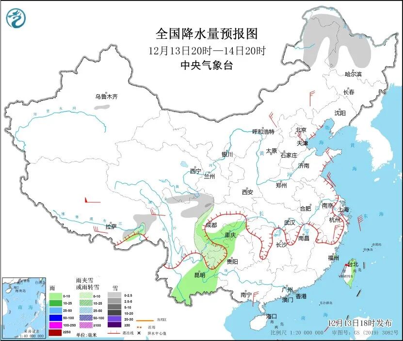 中央气象台预计,13日20时至14日20时,内蒙古东北部、黑龙江中西部、西藏东部、青海东南部、川西高原北部、云南东北部、贵州西部等地部分地区有小到中雪或雨夹雪。四川盆地南部、贵州西北部、云南东部和南部、台湾岛北部和东部等地部分地区有小雨。