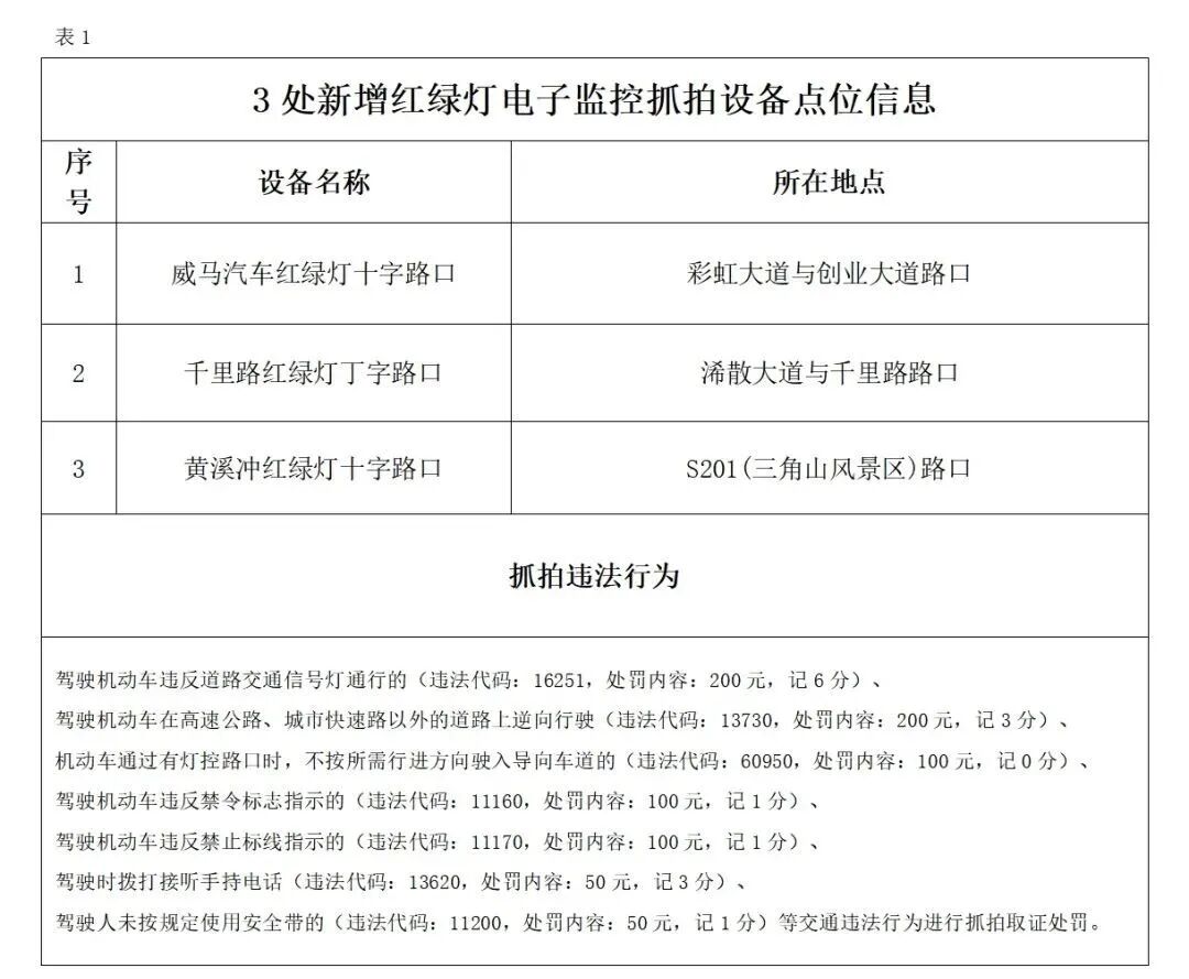 浠水将于2024年12月23日零时启用3处电子警察设备,对驾驶机动车违反道路交通信号灯通行、逆向行驶、违反禁止标线、驾驶时拨打接听手持电话、未按规定使用安全带的等违法行为进行抓拍。