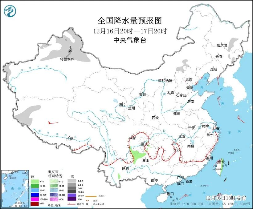 中央气象台预计,12月16日20时至17日20时,新疆北部和南疆西部山区、西藏西部、内蒙古中部、黑龙江东南部、山东半岛沿海地区等地部分地区有小到中雪。贵州西部、云南东北部、台湾岛东部等地部分地区有小雨。