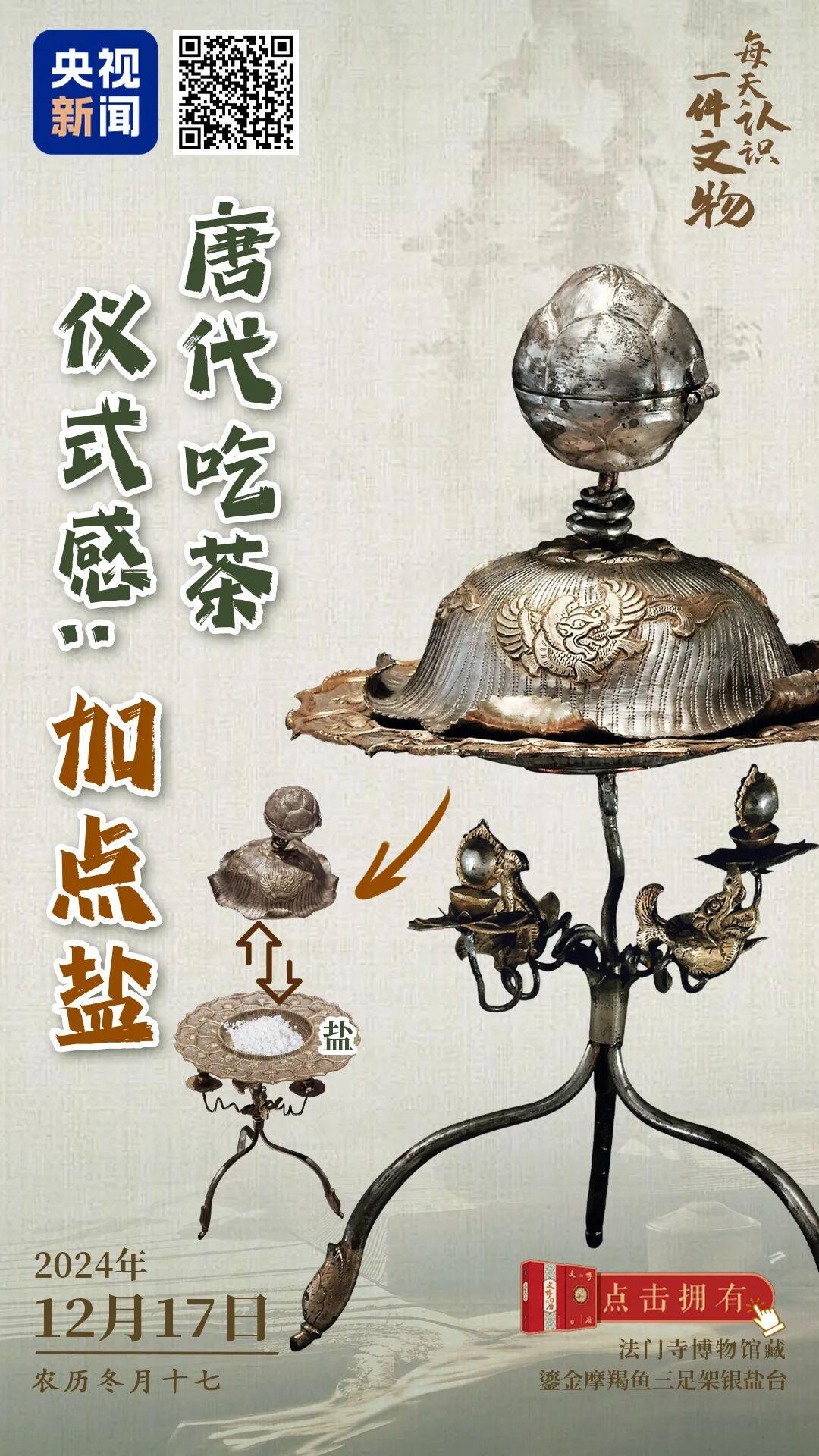 央视新闻联合全国博物馆推出文博科普产品《文博日历》,每天带你认识一件文物。唐朝人饮茶时,会向茶水中加盐、胡椒粉等调味料,以缓解茶水的苦涩、提升茶叶的清香。鎏金摩羯鱼三足架银盐台,就是专门盛放这些调味料的容器,也是目前发现的唯一一件明确标识为用盐的器具。