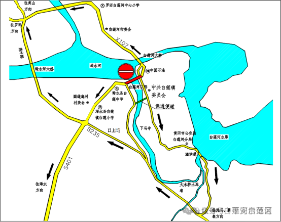 省道S235白莲镇白莲河二桥路段实行全封闭施工、禁止一切社会车辆通行的交通管制措施。