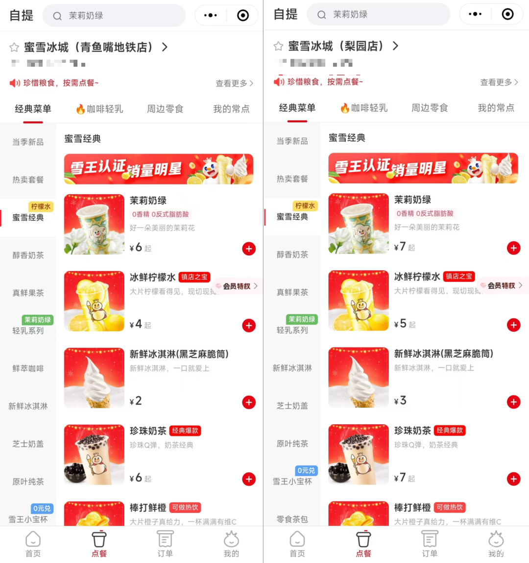 此次调价涉及的主要是堂食和小程序点单,第三方外卖平台价格目前维持不变,不过以广州门店为例,蜜雪冰城的饮品在外卖平台上的价格,本来就比堂食普遍要贵1元。