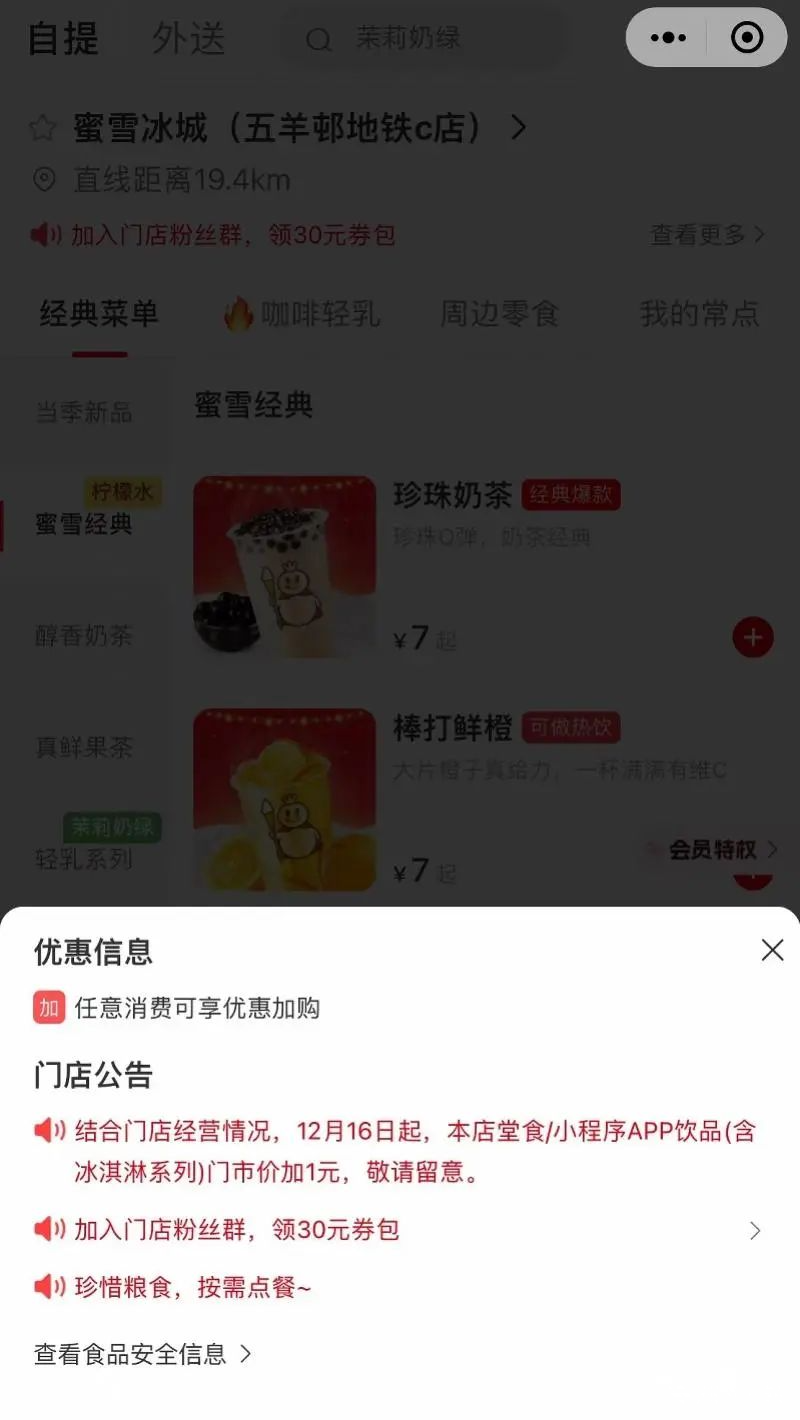12月16日,广州多家蜜雪冰城门店在小程序上发布公告称,“综合门店经营情况,12月16日起,本店堂食|小程序APP饮品(含冰淇淋系列)门市价加1元”。