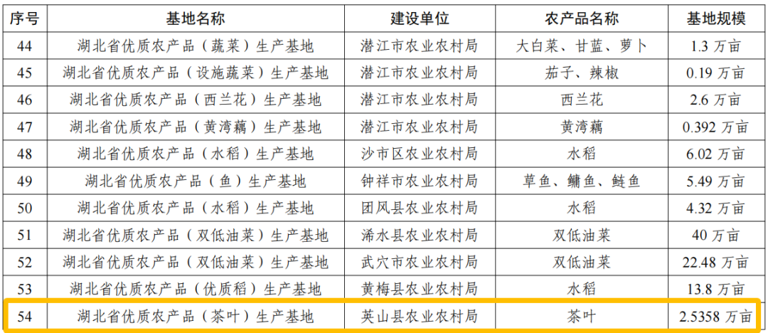 湖北省农业农村厅公布2024年第一批湖北省优质农产品生产基地名单,英山“茶叶”生产基地名列其中。