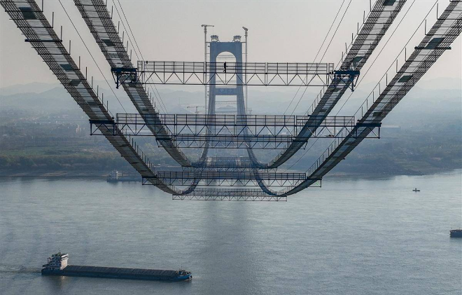 12月16日,工人在燕矶长江大桥施工猫道上进行铺设作业。猫道是悬索桥施工时架设在主缆之下、平行于主缆的线形临时施工便道。目前燕矶长江大桥猫道施工已进入尾声,预计年内可完成,随后就可启动主缆架设。(详情)