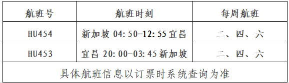 该航线由海南航空执行,计划每周执行三个往返航班,班期为每周二、四、六,具体时刻安排为:去程计划于20:00从宜昌三峡国际机场起飞,03:45抵达新加坡樟宜国际机场;返程计划于04:50从新加坡樟宜国际机场起飞,12:55抵达宜昌三峡国际机场。以上航班信息以订票系统查询为准。