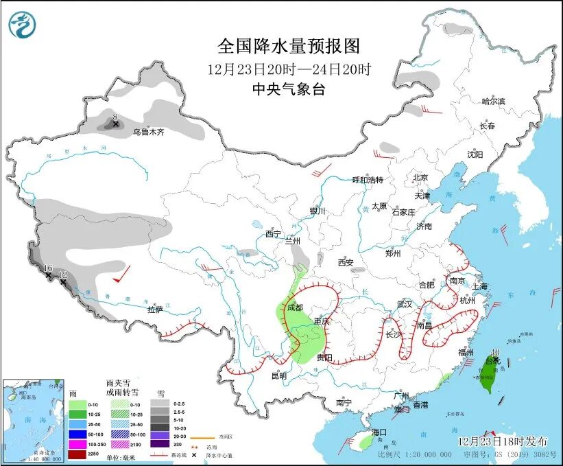 中央气象台预计,23日20时至24日20时,新疆北部和南疆山区、西藏西部和南部、青海西部、甘肃南部、内蒙古东部和中部等地部分地区有小雪或雨夹雪,其中,新疆伊犁河谷、西藏南部等地部分地区有中到大雪,局地暴雪。四川盆地西部和东南部、贵州西部、云南东北部、海南岛东部及台湾岛等地部分地区有小到中雨,局地有大雨。