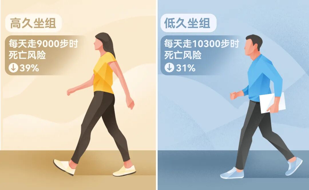 研究发现,无论参与者坐了多久,只要每天走路超过2200步,就能够有效对抗久坐带来的健康威胁,降低心血管疾病的风险。而想要效果最佳,建议走到9000至15000步。具体来说,高久坐组的人,每天走9000步时,死亡风险降低了39%;低久坐组的人,每天走10300步时,死亡风险降低了31%。