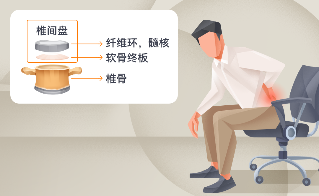 我们的腰椎有五块,而腰椎之间的特殊结构叫做椎间盘,由软骨终板、纤维环和髓核三部分构成。当长时间保持同一个坐姿或错误坐姿,椎间盘的压力会明显增大,保护髓核的纤维环可能会破裂,髓核因此可能突出或脱离正常位置,形成我们常说的“腰椎间盘突出”。在腰椎间盘突出的早期阶段,大多数人会经历不同程度的腰部和腿部疼痛,还有一些人可能会感到下肢麻木、无力,如果这些症状长时间没有得到缓解,建议及时就医。