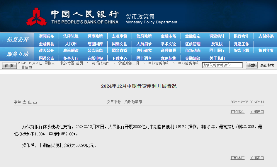 MLF缩量续作反映市场流动性充裕,资金面保持宽松态势。今年央行完善了货币政策操作框架,MLF明确采用利率招标,操作量由央行事先给定。此次MLF操作只投放3000亿元,说明央行对当前市场流动性状况的判断是充裕的,进一步大量投放的必要性较低,这也可以从市场利率得到印证。12月以来,银行间隔夜利率基本运行在1.5%下方,国有大行发行的1年期同业存单利率已降至不足1.7%,各期限资金供给都非常充裕,为平稳跨年、跨春节提供了适度宽松的流动性环境,体现了对中央经济工作会议最新要求的积极贯彻落实。央行流动性投放渠道更加多样,工具操作更为从容。今年以来,央行工具箱得到了进一步扩充,在公开市场操作中增加了国债买卖、买断式逆回购等工具,也有条件适度平滑四季度集中到期的MLF,减轻滚续操作压力。10月、11月央行MLF操作分别净回笼890亿元、5500亿元,但通过国债买卖、买断式逆回购操作均实现了全月中长期资金的净投放,且期限品种更为灵活。据机构反映,12月央行也已开展各类工具操作,预计国债买卖、买断式逆回购的总操作量仍会显著大于MLF到期量,保障了市场流动性状况充裕。新工具置换MLF有利于降低资金成本,缓解银行净息差压力。往年年末央行通过加大MLF操作的方式供应流动性,今年在降准补充长钱的基础上,更多运用买断式逆回购和7天期逆回购操作,期限相对更短,利率也更低,既满足了机构跨年资金需求,又减轻了机构负债成本,与整治违规手工补息、同业活期存款自律等打了一套组合拳,有利于稳定银行合理的净息差,并进一步向实体经济传导,推动降低企业和居民信贷成本。新货币政策操作框架下,MLF操作更加市场化,中标利率已不具备政策含义。下半年以来,MLF改为市场化利率招标,参与机构更多参考1年期同业存单利率投标,因此MLF中标利率已没有政策含义。目前国有和股份行1年期同业存单利率在1.65%附近,这类银行投标MLF的利率不会高出太多,中小银行由于融资能力相对弱,投标MLF的利率会高一些。如果流动性充裕,MLF做得少,利率招标机制下优先满足高利率投标,则MLF中标利率不一定低;如果央行需要用MLF投放更多中长期资金,覆盖更大范围投标,估计MLF中标利率将下行。考虑到工具之间的替代性,MLF投的多其他工具就用的少,市场对此应理性、辩证看待。来源/中国人民银行官网、央视财经微信