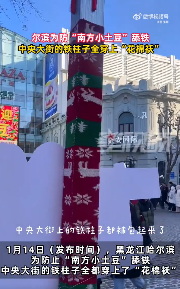为了防止游客们舔柱子受伤,上个冰雪季的时候,哈尔滨中央大街的柱子都“穿上了花棉袄”。