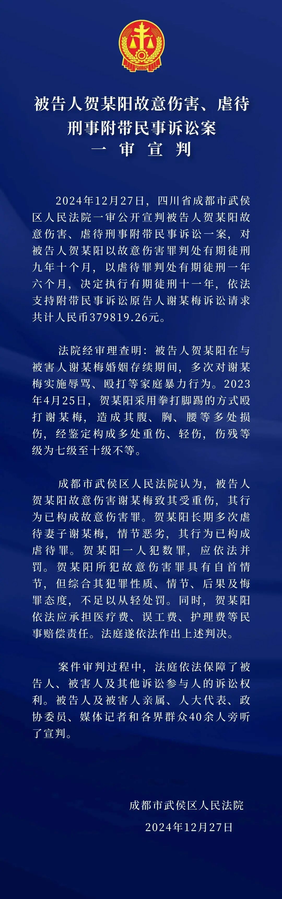 27日,四川“女子结婚两年被家暴多次”案一审宣判,被告人贺某阳犯故意伤害罪和虐待罪,被判处11年有期徒刑。