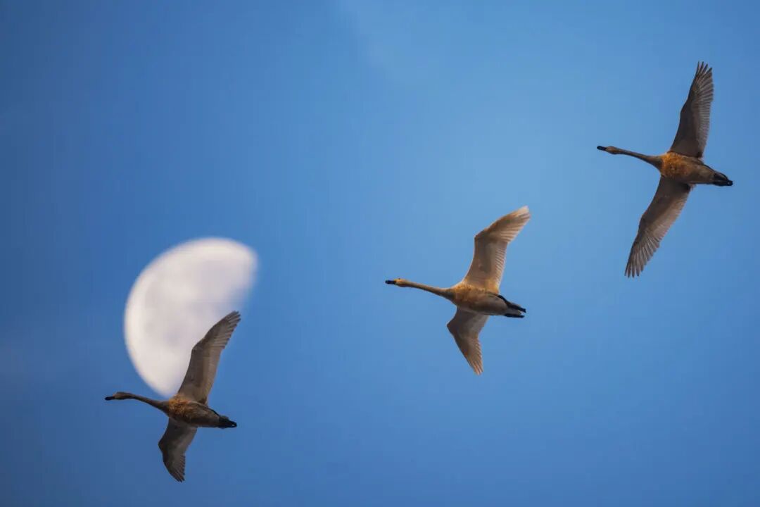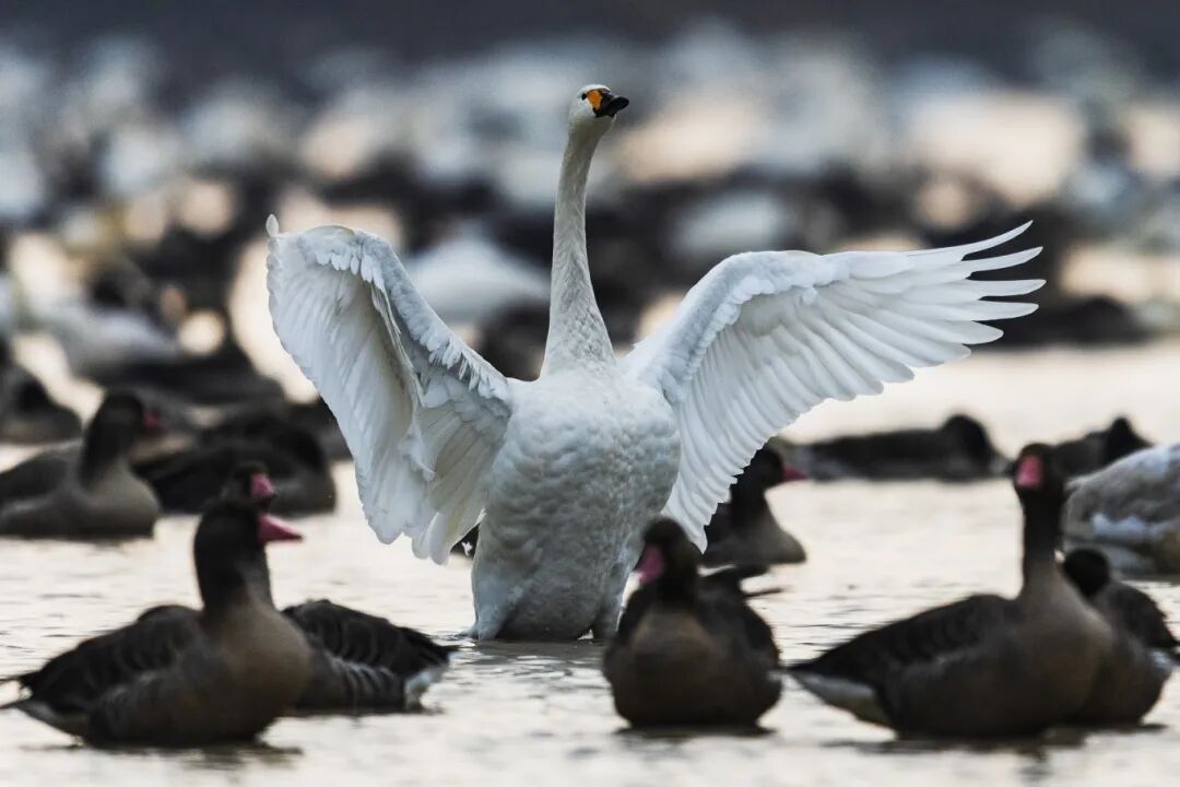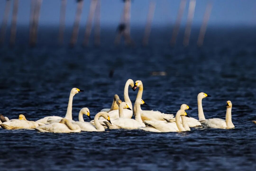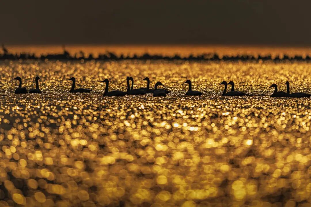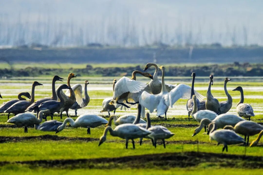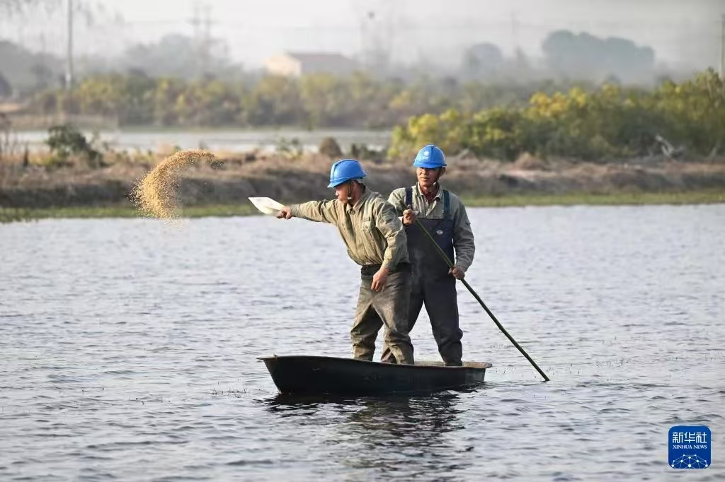 ▲12月3日,护鸟志愿队队员在龙感湖国家级自然保护区投放鸟食。新华社记者杜子璇 摄