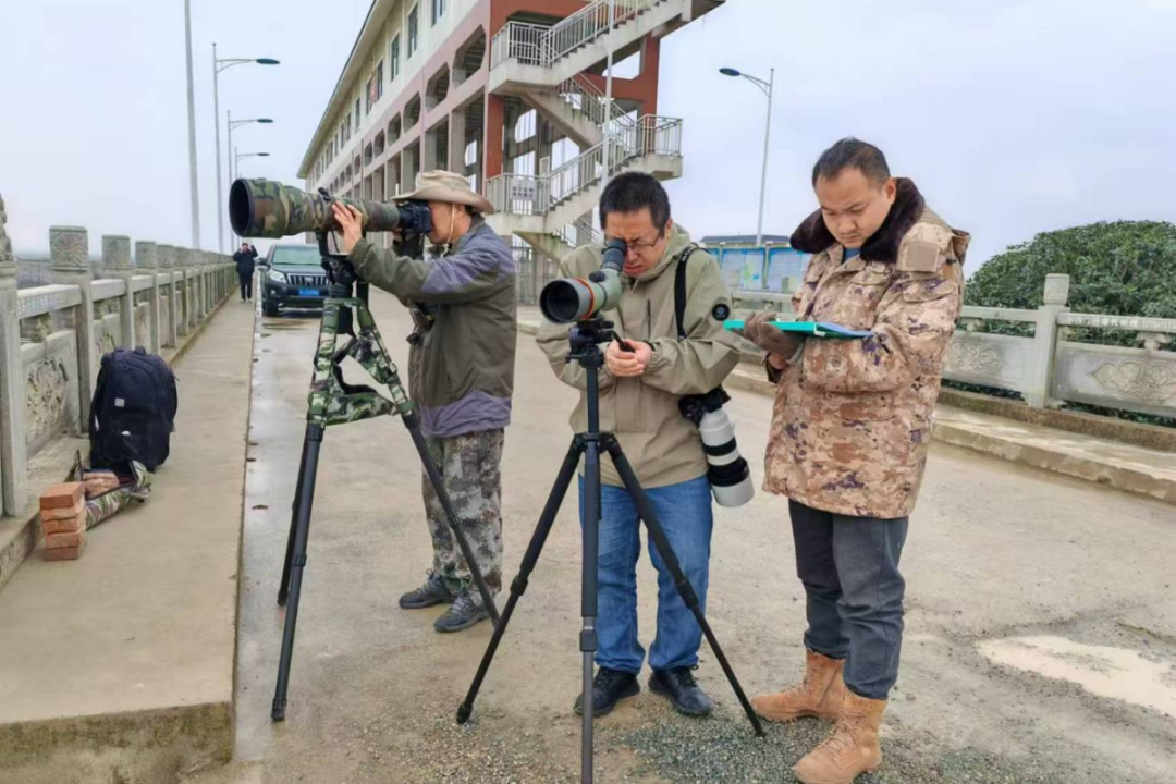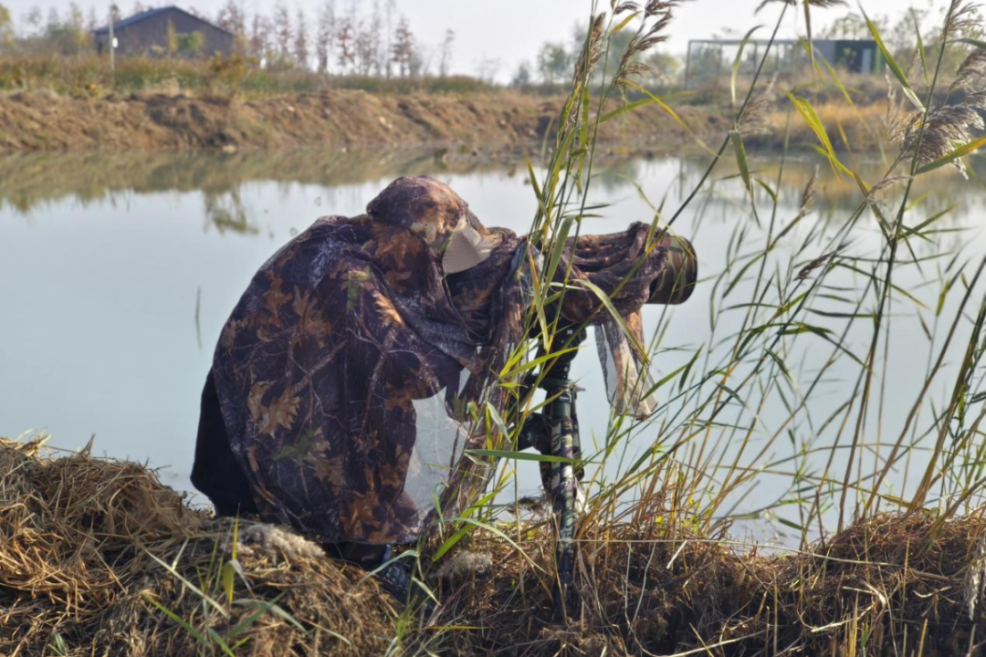 ▲摄影爱好者隐蔽拍摄候鸟。记者陈爱武 摄