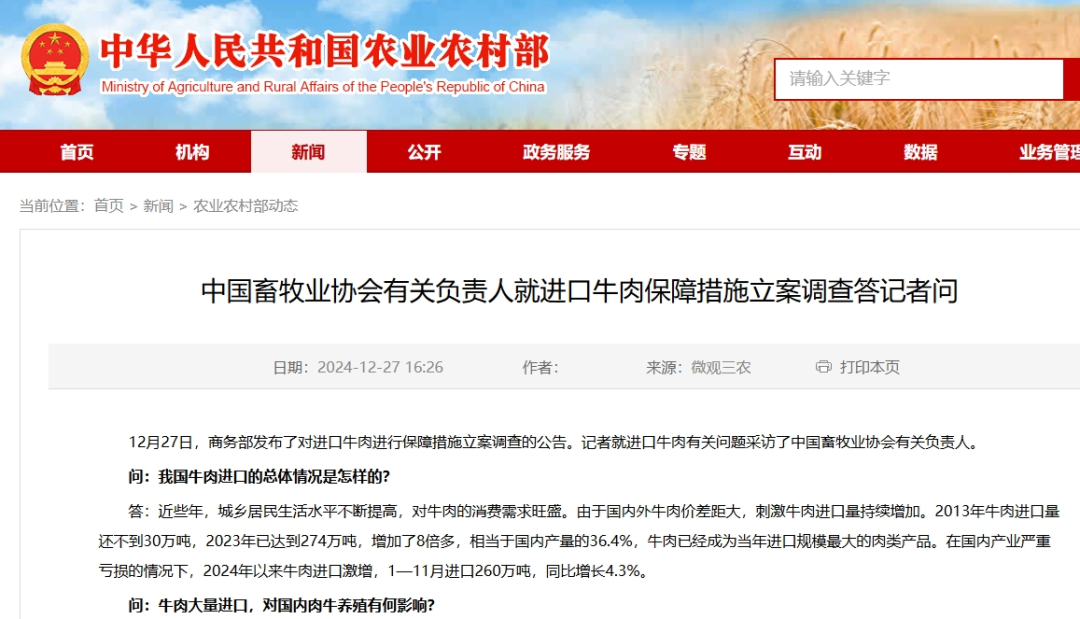 12月27日,中国畜牧业协会有关负责人就进口牛肉保障措施立案调查答记者问。