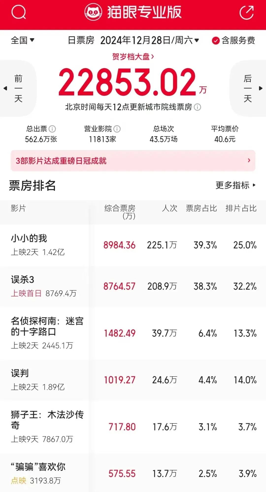据网络平台数据截至12月29日10时47分2024年贺岁档档期总票房达25.65亿元《好东西》《小小的我》《误判》