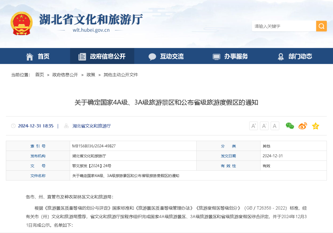 2024年12月31日,湖北省文化和旅游厅发布《关于确定国家4A级、3A级旅游景区和公布省级旅游度假区的通知》,我市红安锦绣铜锣景区、英山毕昇纪念园、蕲春李时珍文化旅游区被确定为国家4A级旅游景区。