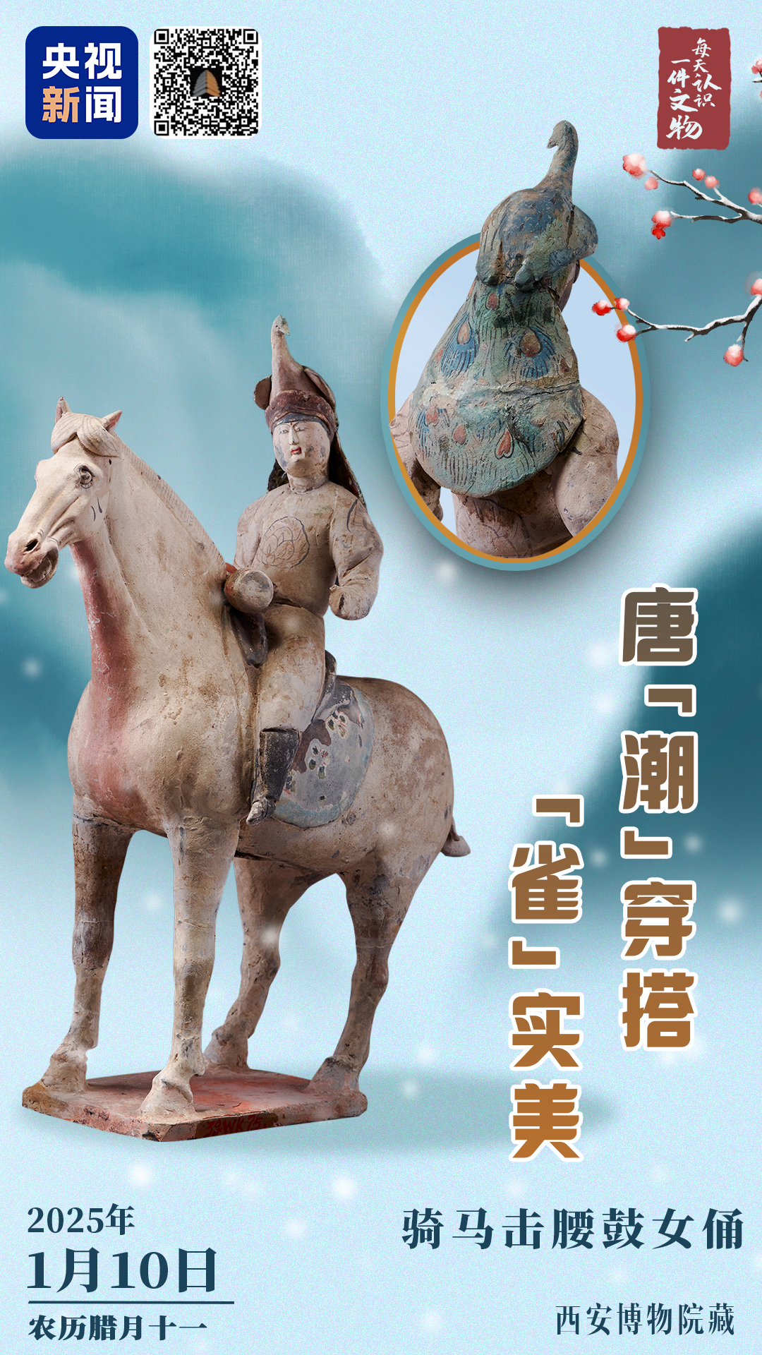 央视新闻联合全国博物馆推出文博科普产品《文博日历》,每天带你认识一件文物。这件骑马击腰鼓女俑的头冠造型是一整只孔雀,这只孔雀翘首远眺,长而宽大的尾羽如瀑布般垂在女俑的肩背上。孔雀造型做头冠装饰的陶俑,在目前出土的陶俑文物中堪称独一无二。