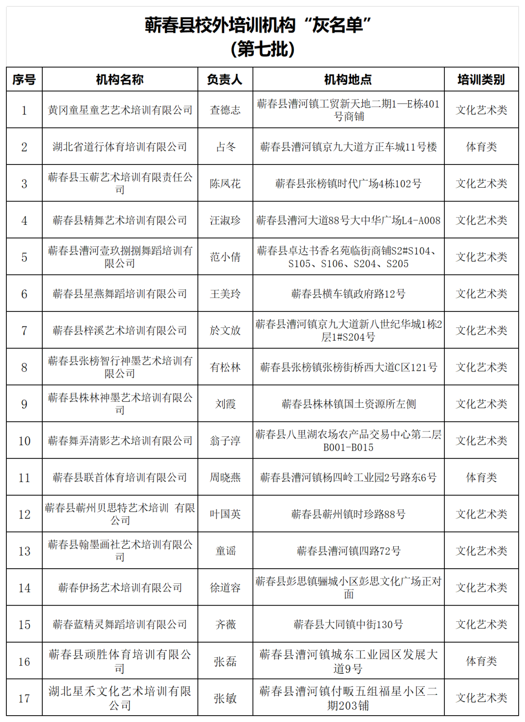 附:蕲春县校外培训机构“白、灰、黑名单”(第七批)