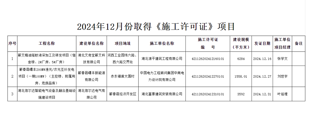 近日,蕲春县人民政府官方网站发布信息,据县住建局对外公布关于取得工程施工许可的公告显示,我县2024年12月份有3处项目获得施工许可。