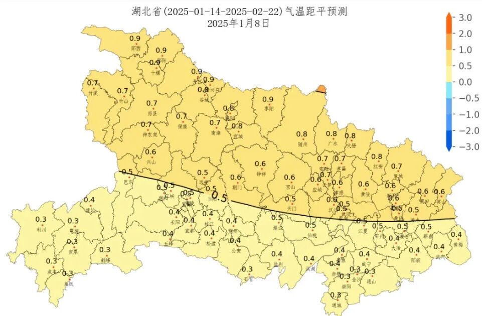 受偏弱的西伯利亚高压和南支槽影响,预计春运期全省降水偏少,气温偏高。降水量较常年同期偏少1~3成,其中,鄂西北14~30毫米、鄂东南60~85毫米、其他地区30~60毫米;平均气温较常年同期偏高0.3~0.9℃,其中鄂西北4.3~5℃、其他地区5~7℃,极端最低气温北部-8~-6℃、南部-5~-4℃。